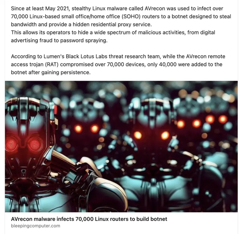 Purely coincidentally while perusing LinkedIn, I came across interesting research done by Danny Adamitis and Steve Rudd of Black Lotus Labs, the threat intelligence arm of Lumen (formerly known as CenturyLink). The specific article, posted just a few weeks ago on July 12, dives deep into a piece of SOHO-based malware they are calling AVrecon. Instead of rehashing the article, I highly recommend reading it. It would do it an injustice to try to summarize it.