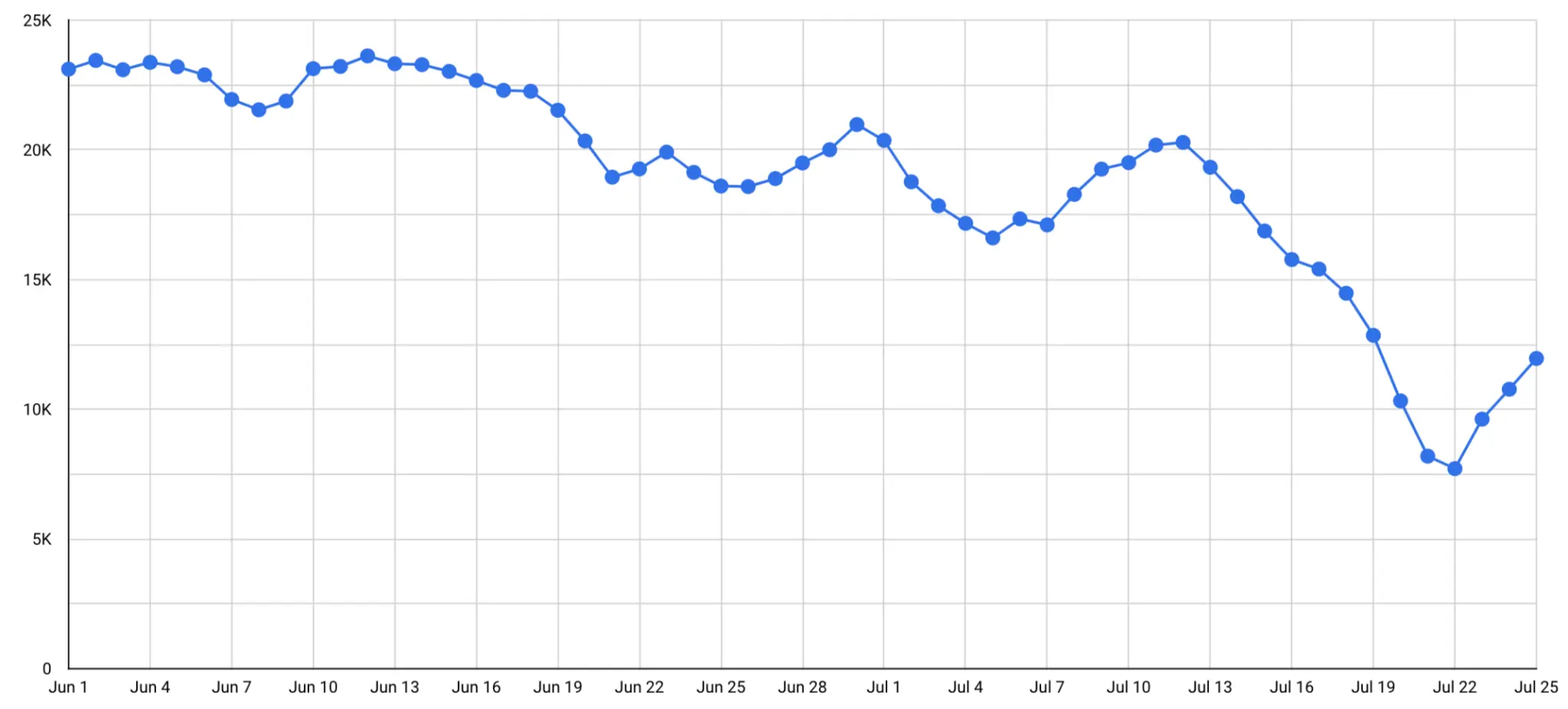 Around July 11, we started noticing a significant downward trend in the number of available endpoints. The count of available endpoints for a given service tends to ebb and flow but this halving of the online proxy count merited a closer look.