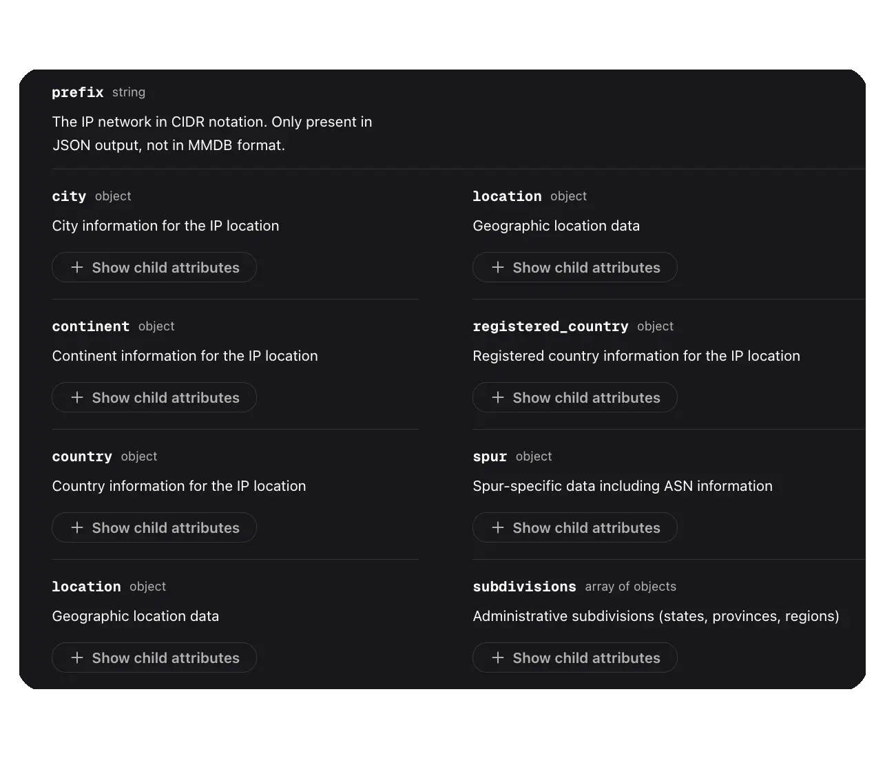 - Seamless Integration: IP Geo is available to integrate with your Spur Data Feeds or plug into your existing analytical pipelines.