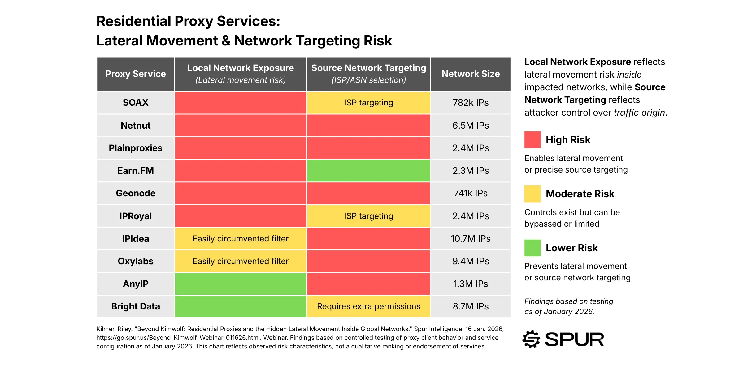 Spur contributed to recent Google Threat Intelligence research on disrupting the largest known residential proxy network. The findings published by Google reflect the same residential proxy behaviors and risks explored in this post, with our analysis focused specifically on lateral movement and internal network exposure.